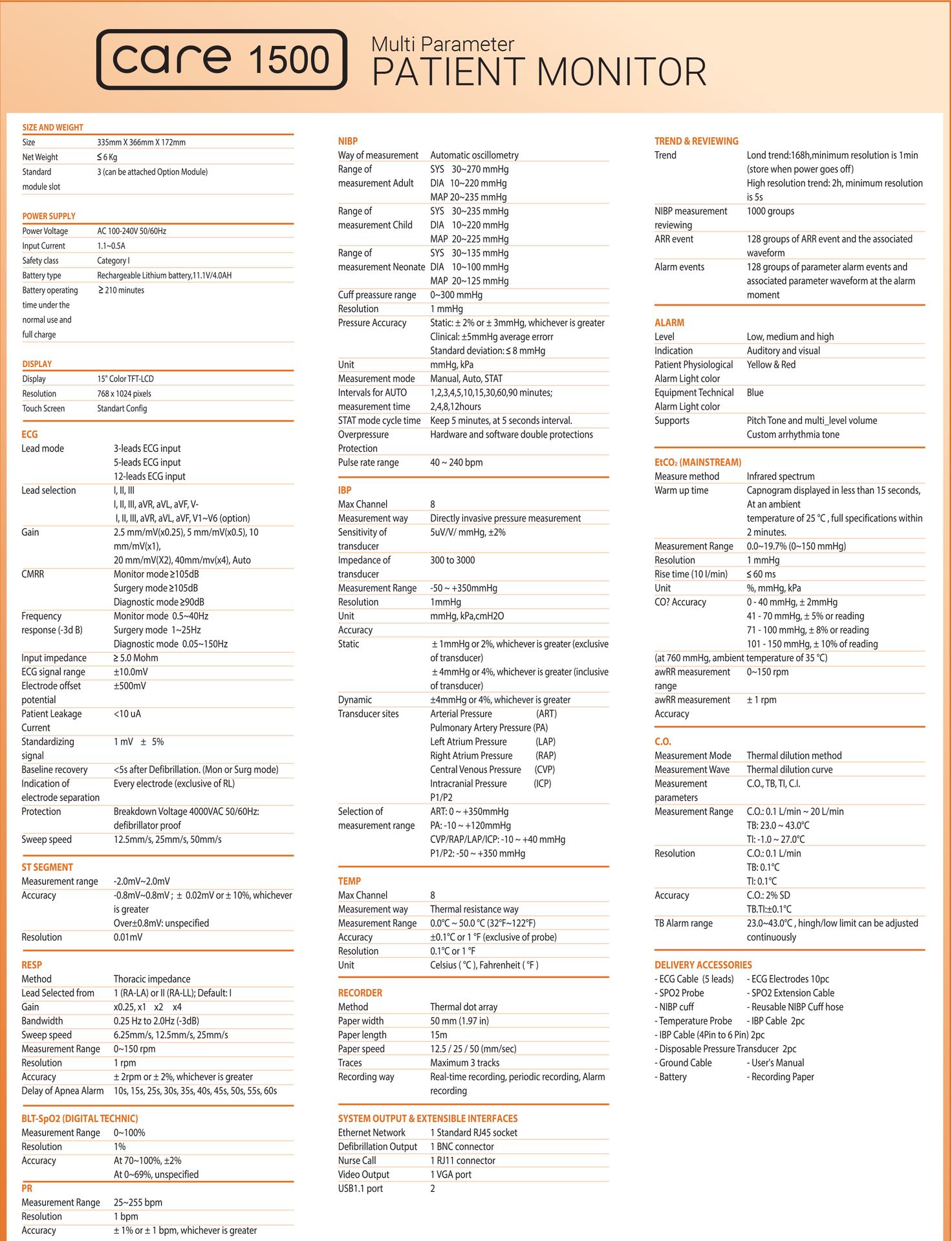 * Parameter 3/5 Lead ECG, HR, RR, SpO2, Temp, Nibp, (IBP optional)
