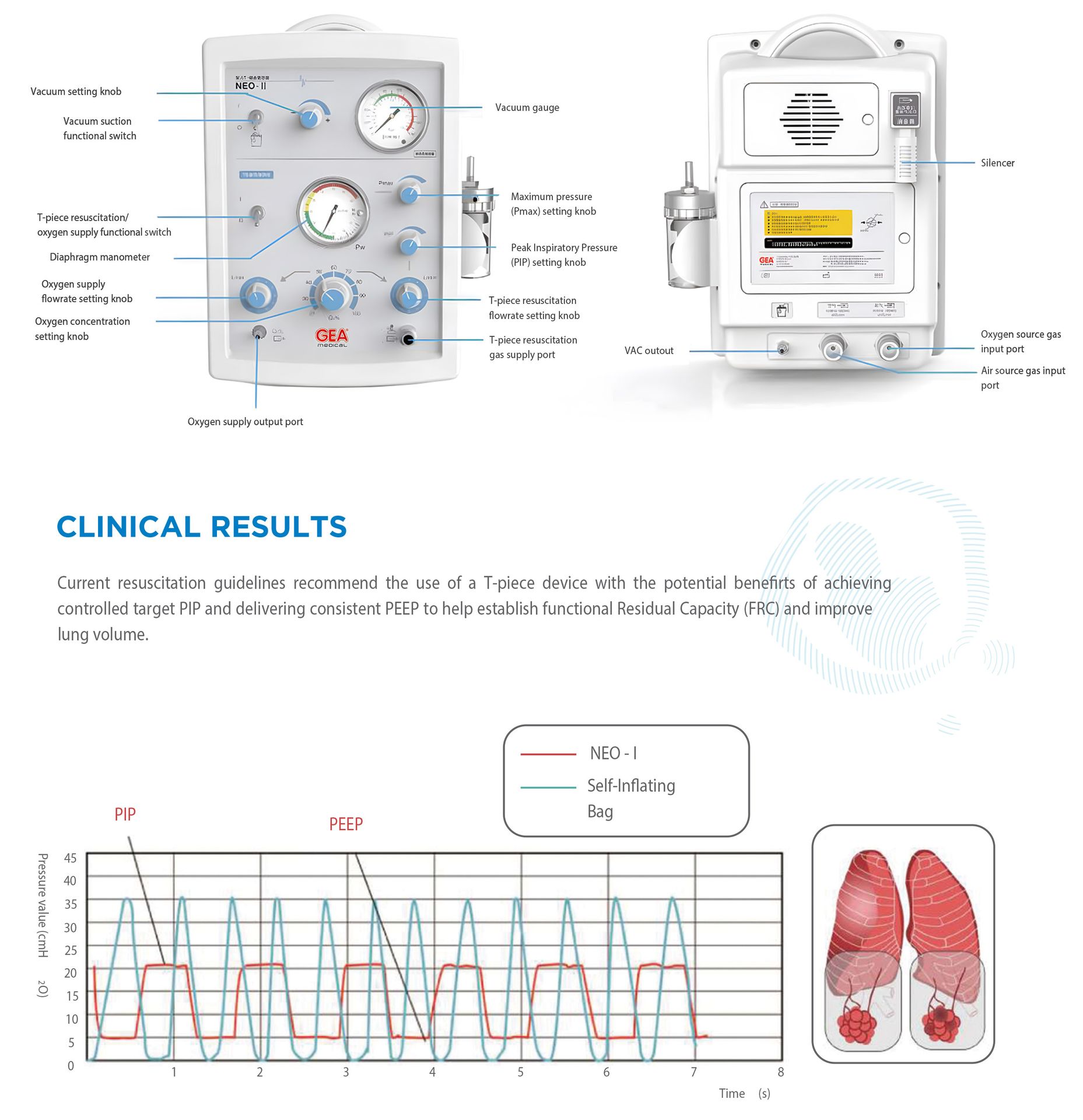 The GEA NEO BREATH-II is designed according to the latest resuscitation guidelines from ILCOR and AHA’s AAP (NRP) to ensure effective and safe airway management during the resuscitation process. This device provides safe, stable, and controllable peak inspiratory pressure (PIP). It is manually operated with pneumatic power and is suitable for infants weighing under 10 kg, particularly premature babies. It is ideal for use in delivery rooms, transportation, NICU, and other neonatal care units.