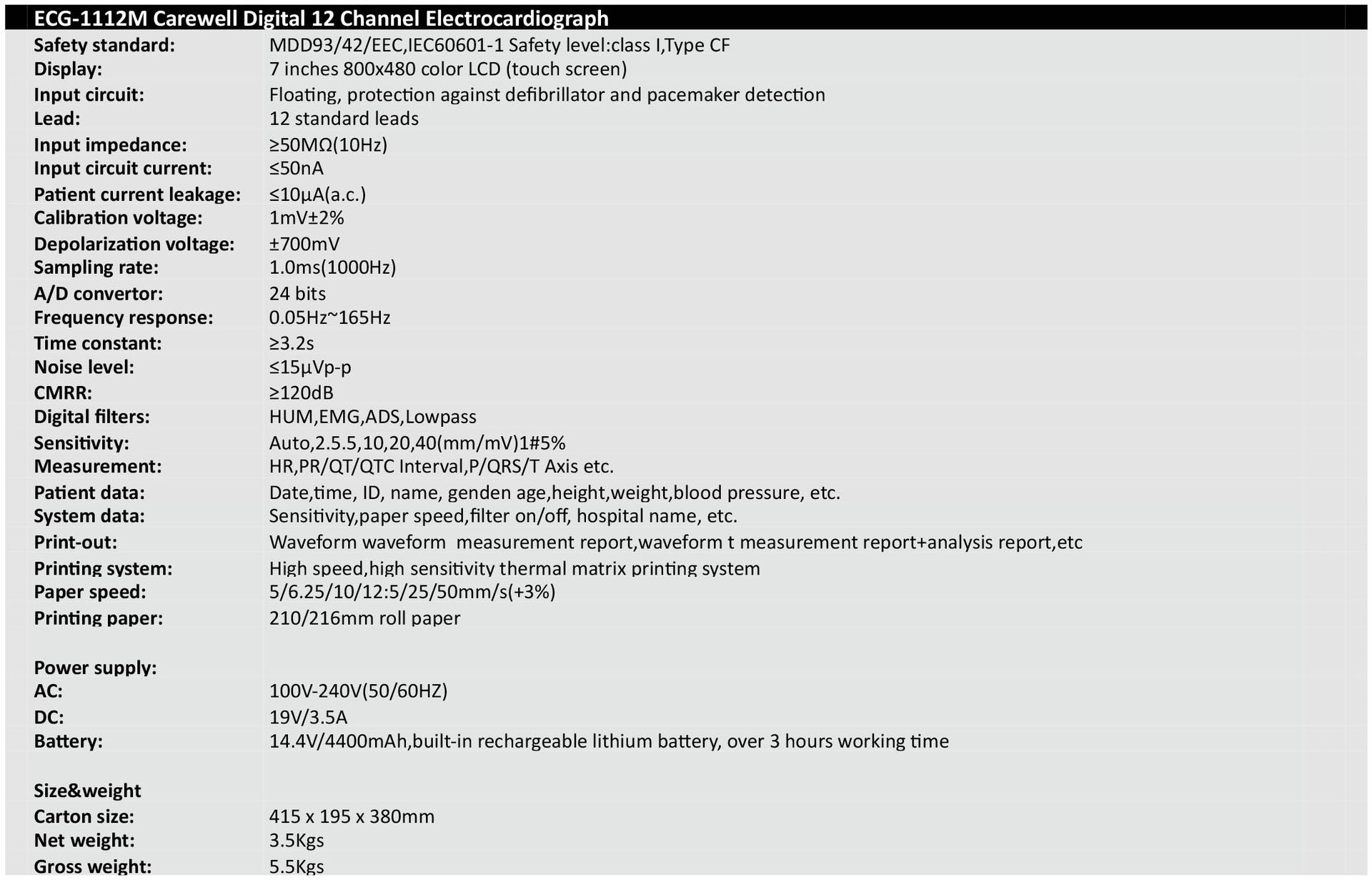 Carewell EKG Monitor 12 Channel 1112M LCD 7"